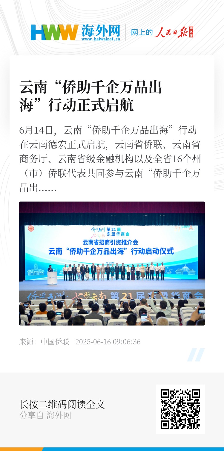 此次云南“侨助千企万品出海”行动的正式启航,是云南积极融入国家“一带一路”倡议、深化对外开放合作的重要举措。未来,云南将继续发挥侨力、凝聚侨智,深化与周边国家多领域合作,推动“千企万品”走向世界。