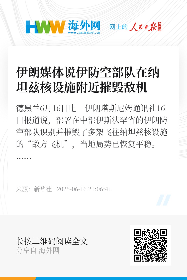 新华社德黑兰6月16日电 伊朗塔斯尼姆通讯社16日报道说,部署在中部伊斯法罕省的伊朗防空部队识别并摧毁了多架飞往纳坦兹核设施的“敌方飞机”,当地局势已恢复平稳。