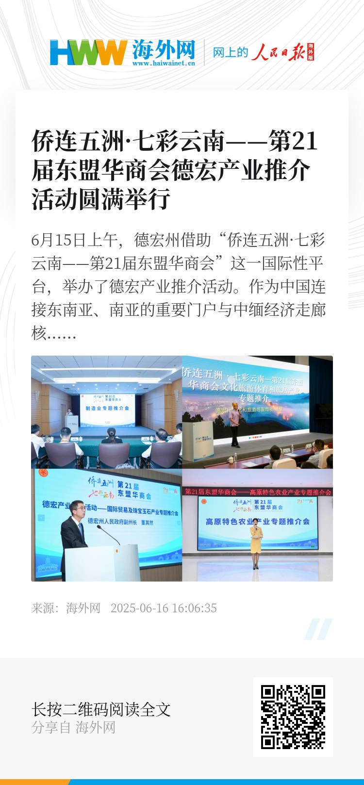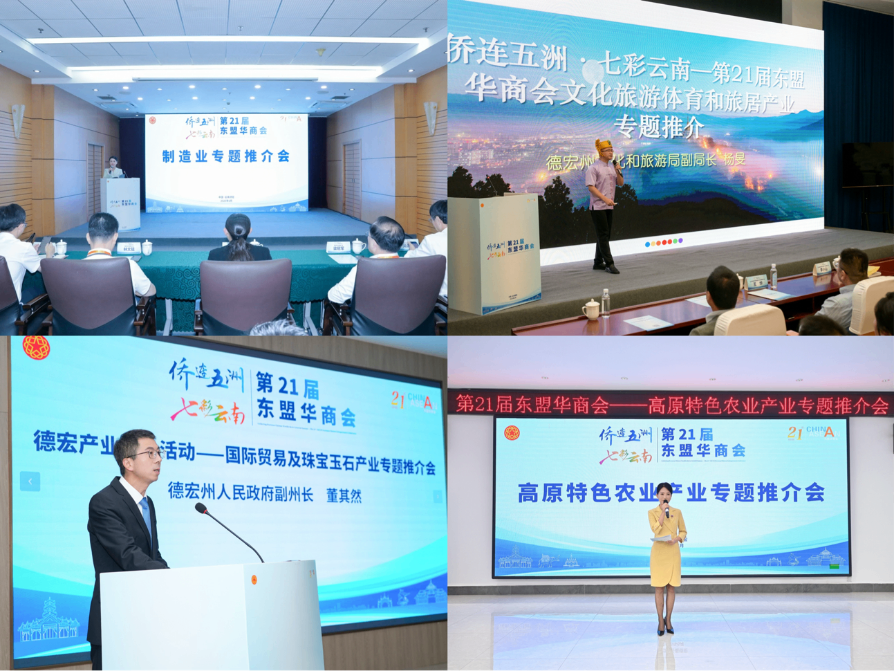 6月15日上午,德宏州借助“侨连五洲·七彩云南——第21届东盟华商会”这一国际性平台,举办了德宏产业推介活动。作为中国连接东南亚、南亚的重要门户与中缅经济走廊核心节点,德宏州依托东盟华商会的国际影响力与资源整合能力,深度展示制造业、文旅康养、国际贸易及高原特色农业四大产业的独特优势与发展潜力。