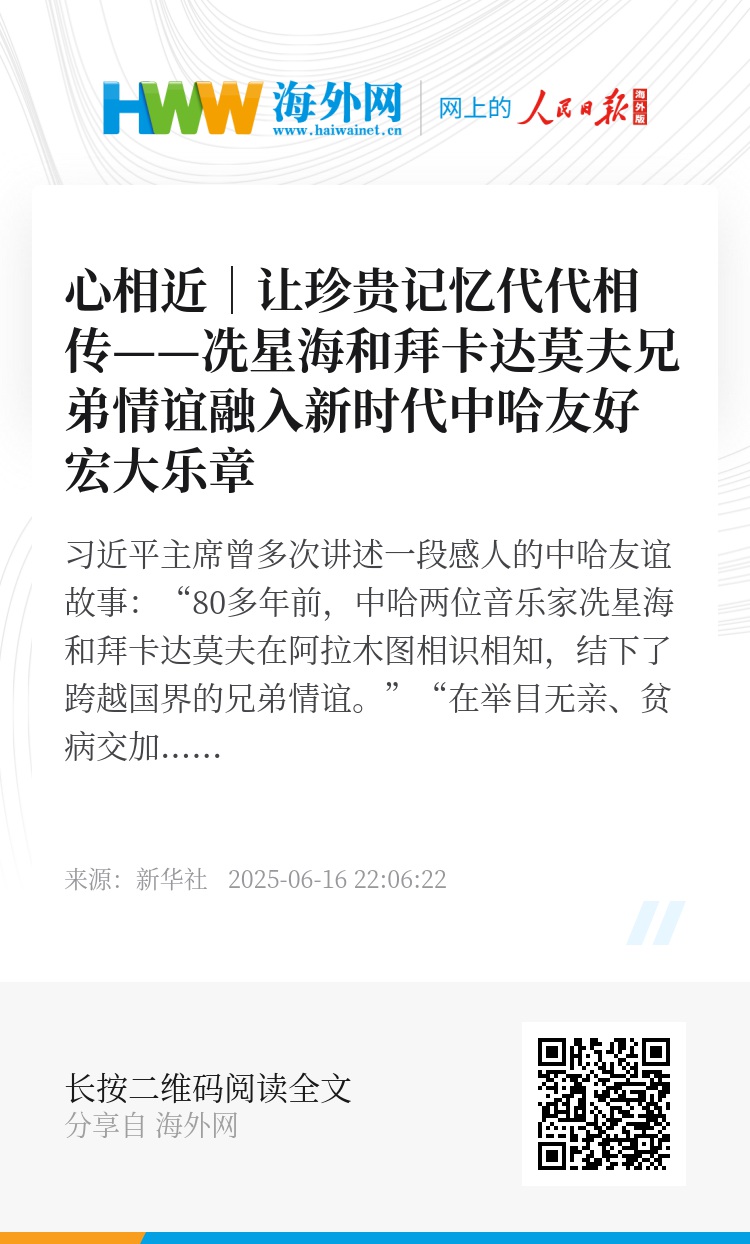习近平主席曾多次讲述一段感人的中哈友谊故事:“80多年前,中哈两位音乐家冼星海和拜卡达莫夫在阿拉木图相识相知,结下了跨越国界的兄弟情谊。”“在举目无亲、贫病交加之际,哈萨克音乐家拜卡达莫夫接纳了他,为他提供了一个温暖的家。”