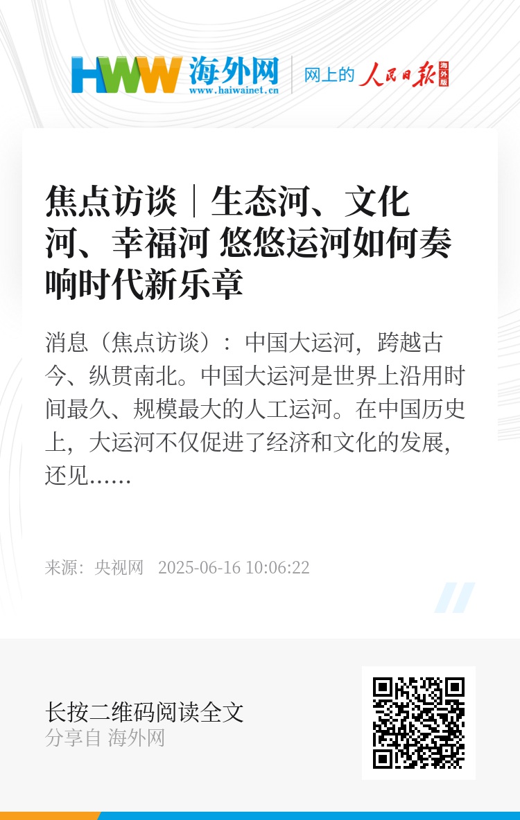 央视网消息(焦点访谈):中国大运河,跨越古今、纵贯南北。中国大运河是世界上沿用时间最久、规模最大的人工运河。在中国历史上,大运河不仅促进了经济和文化的发展,还见证了人文与自然的和谐交融。2014年,中国大运河被正式列入《世界遗产名录》。进入新时代,习近平总书记高度重视大运河的保护、传承、利用,多次深入运河沿线考察调研。今天我们如何传承大运河千年历史,让它焕发新生呢?