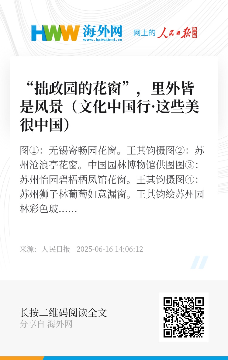 从举世闻名的世界文化遗产苏州园林,到一枚花窗书签文创,再到社交媒体热门话题“把拙政园的花窗带回家”,一场跨越时空的美学对话,演绎了当代年轻人与古老园林的审美默契。