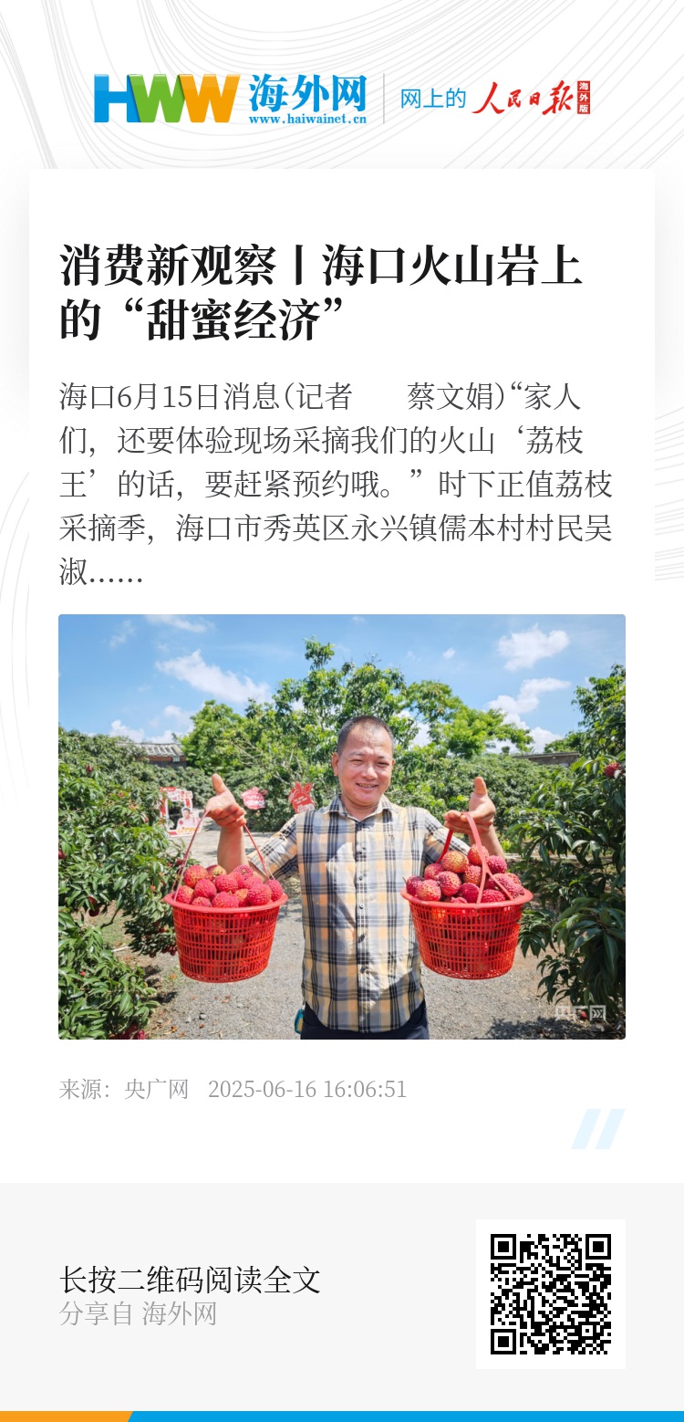 “这里每天都能发出8000斤到1万斤的荔枝,全国各地的订单都有,北京、上海、重庆等地区会稍微多一些。”海口市秀英区永兴镇永德村党支部书记陈槐柏告诉记者,今年还开通了跨境电商渠道,海外消费者也可以体验到“即买即发”带来的这口来自火山岩石上的甜蜜。