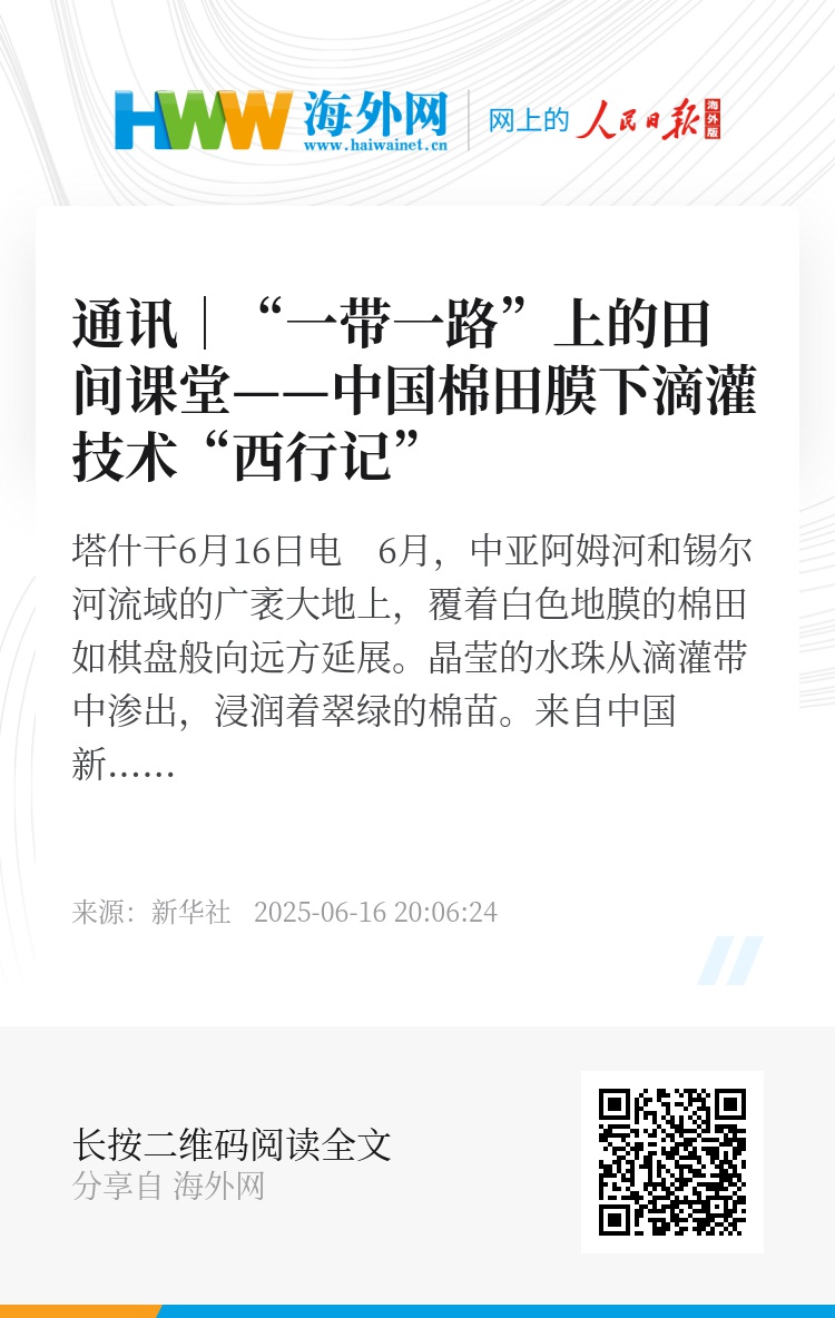 新华社塔什干6月16日电 6月,中亚阿姆河和锡尔河流域的广袤大地上,覆着白色地膜的棉田如棋盘般向远方延展。晶莹的水珠从滴灌带中渗出,浸润着翠绿的棉苗。