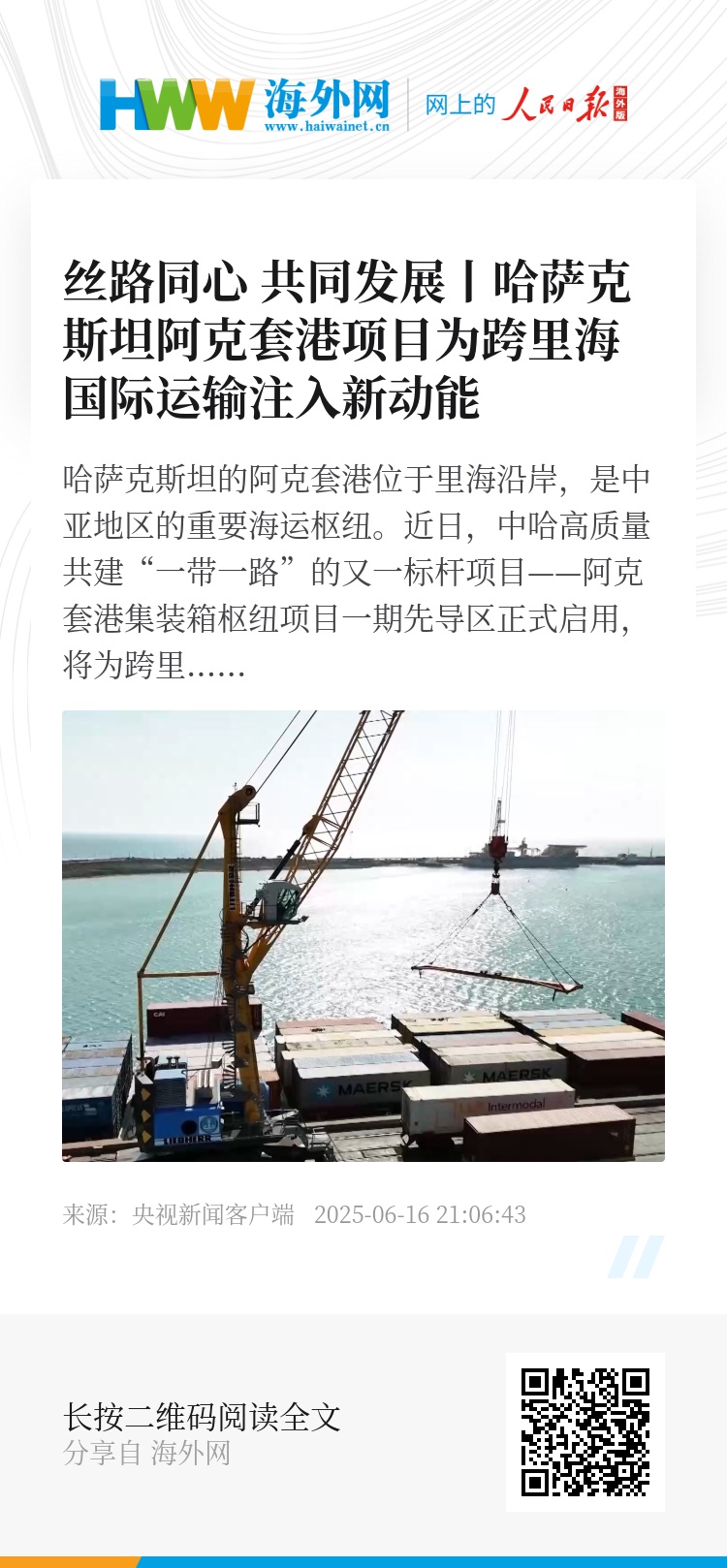 哈萨克斯坦的阿克套港位于里海沿岸,是中亚地区的重要海运枢纽。近日,中哈高质量共建“一带一路”的又一标杆项目——阿克套港集装箱枢纽项目一期先导区正式启用,将为跨里海国际运输走廊注入强劲动能。今天,让我们一起走进这个港口,看看它这些年的变化与发展。