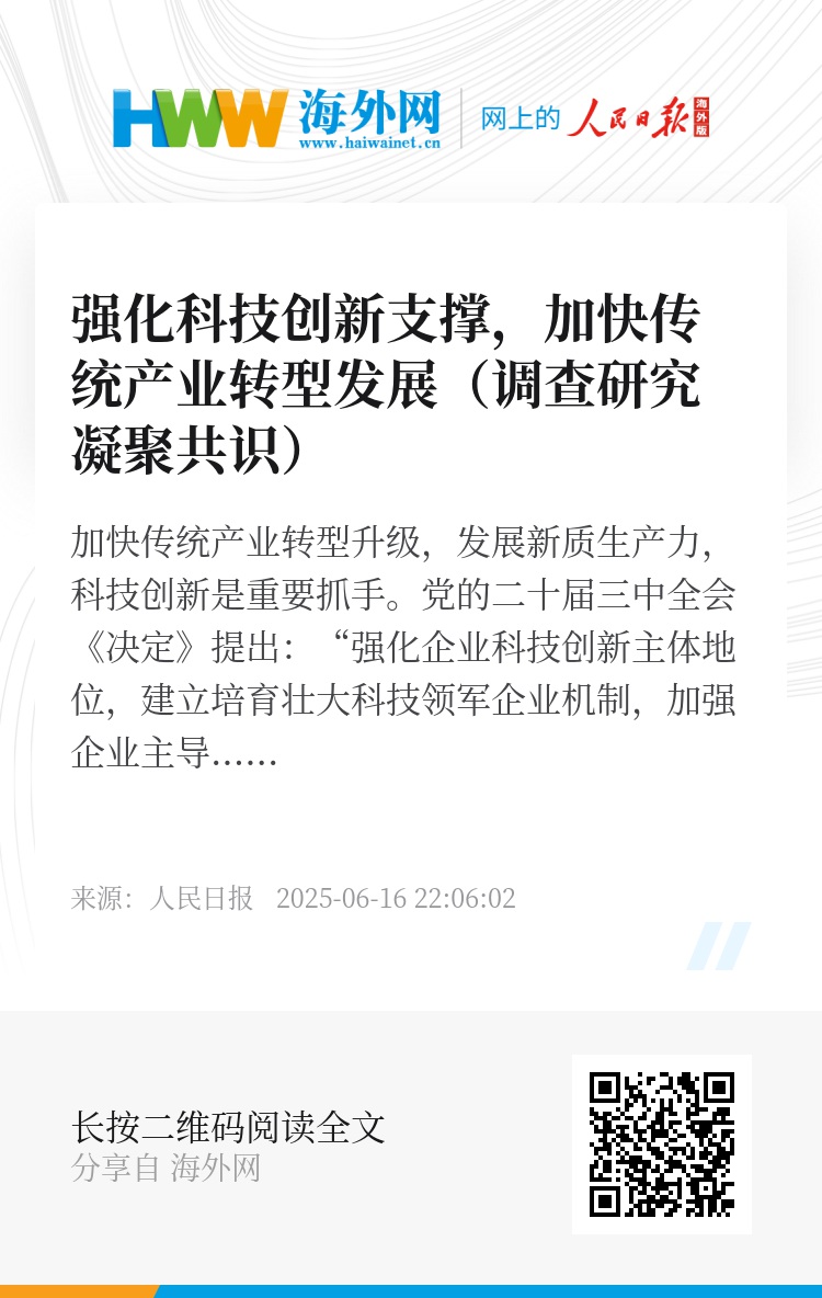 加快传统产业转型升级,发展新质生产力,科技创新是重要抓手。党的二十届三中全会《决定》提出:“强化企业科技创新主体地位,建立培育壮大科技领军企业机制,加强企业主导的产学研深度融合,建立企业研发准备金制度,支持企业主动牵头或参与国家科技攻关任务。”