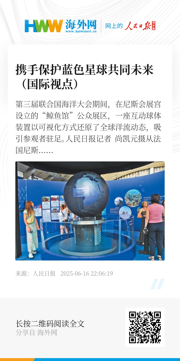 6月9日至13日,第三届联合国海洋大会在法国尼斯举行,汇聚了来自全球170多个国家和地区的1.5万余名代表。大会针对海洋生物多样性保护等问题发布《尼斯海洋行动计划》,呼吁各国采取紧急行动,携手保护蓝色星球共同未来,为全球海洋治理提出方案。中国在相关领域的贡献受到与会者积极评价。