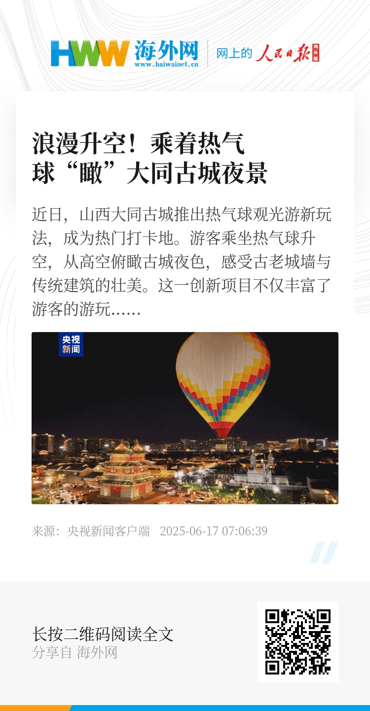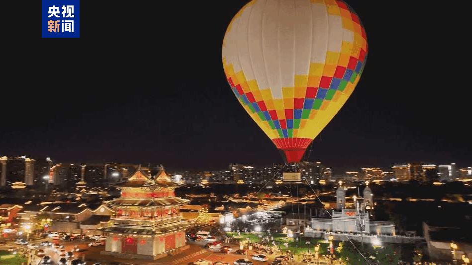 近日,山西大同古城推出热气球观光游新玩法,成为热门打卡地。游客乘坐热气球升空,从高空俯瞰古城夜色,感受古老城墙与传统建筑的壮美。这一创新项目不仅丰富了游客的游玩体验,提升了大同古城的旅游吸引力,还与周边夜市、餐饮等业态深度融合,延长游客停留时间,促进夜间消费,为大同夜经济注入新活力。(总台记者 贺威通)