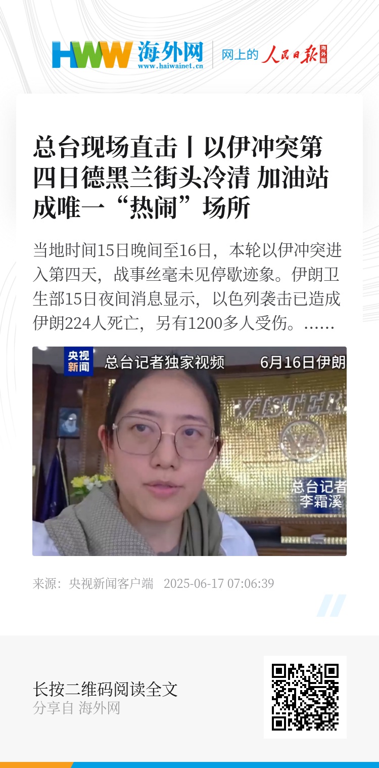当地时间15日晚间至16日,本轮以伊冲突进入第四天,战事丝毫未见停歇迹象。伊朗卫生部15日夜间消息显示,以色列袭击已造成伊朗224人死亡,另有1200多人受伤。身处伊朗首都德黑兰的总台记者带回了这座城市的最新情况。