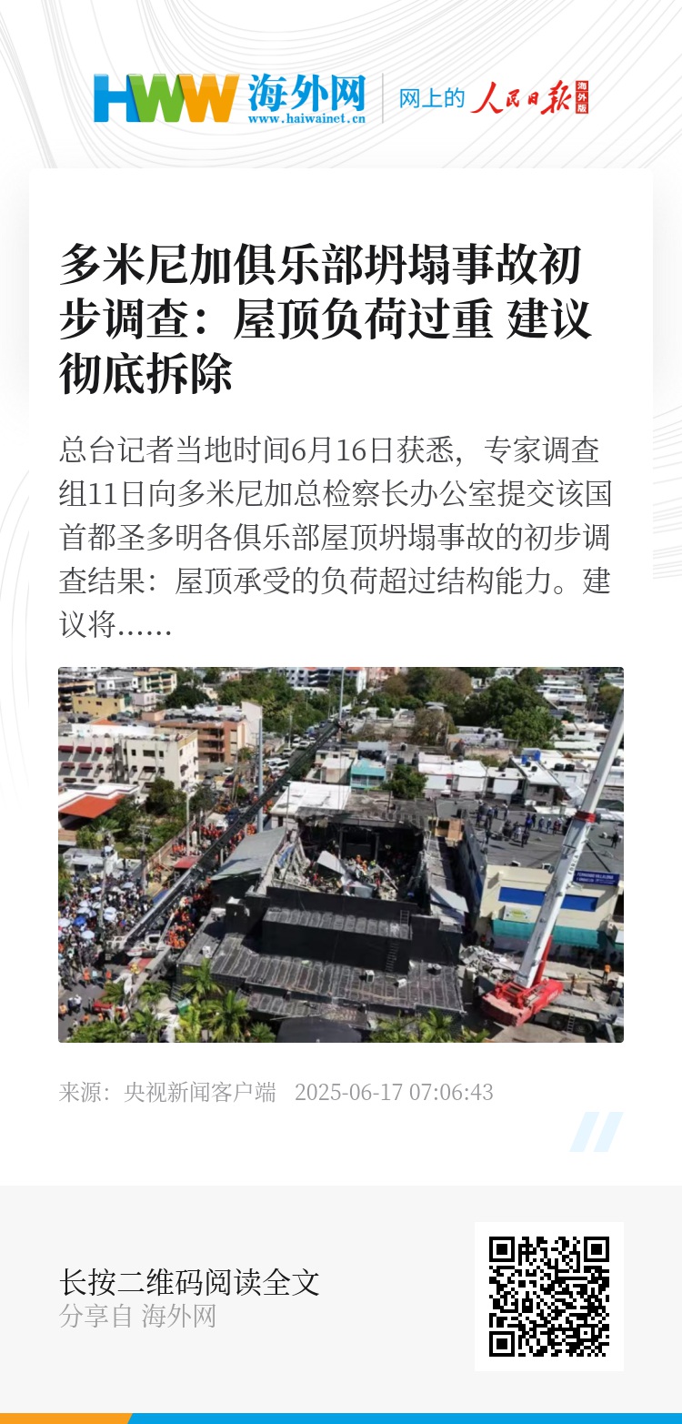 总台记者当地时间6月16日获悉,专家调查组11日向多米尼加总检察长办公室提交该国首都圣多明各俱乐部屋顶坍塌事故的初步调查结果:屋顶承受的负荷超过结构能力。建议将该建筑物完全拆除。