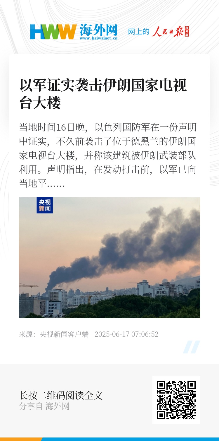 当地时间16日晚,以色列国防军在一份声明中证实,不久前袭击了位于德黑兰的伊朗国家电视台大楼,并称该建筑被伊朗武装部队利用。