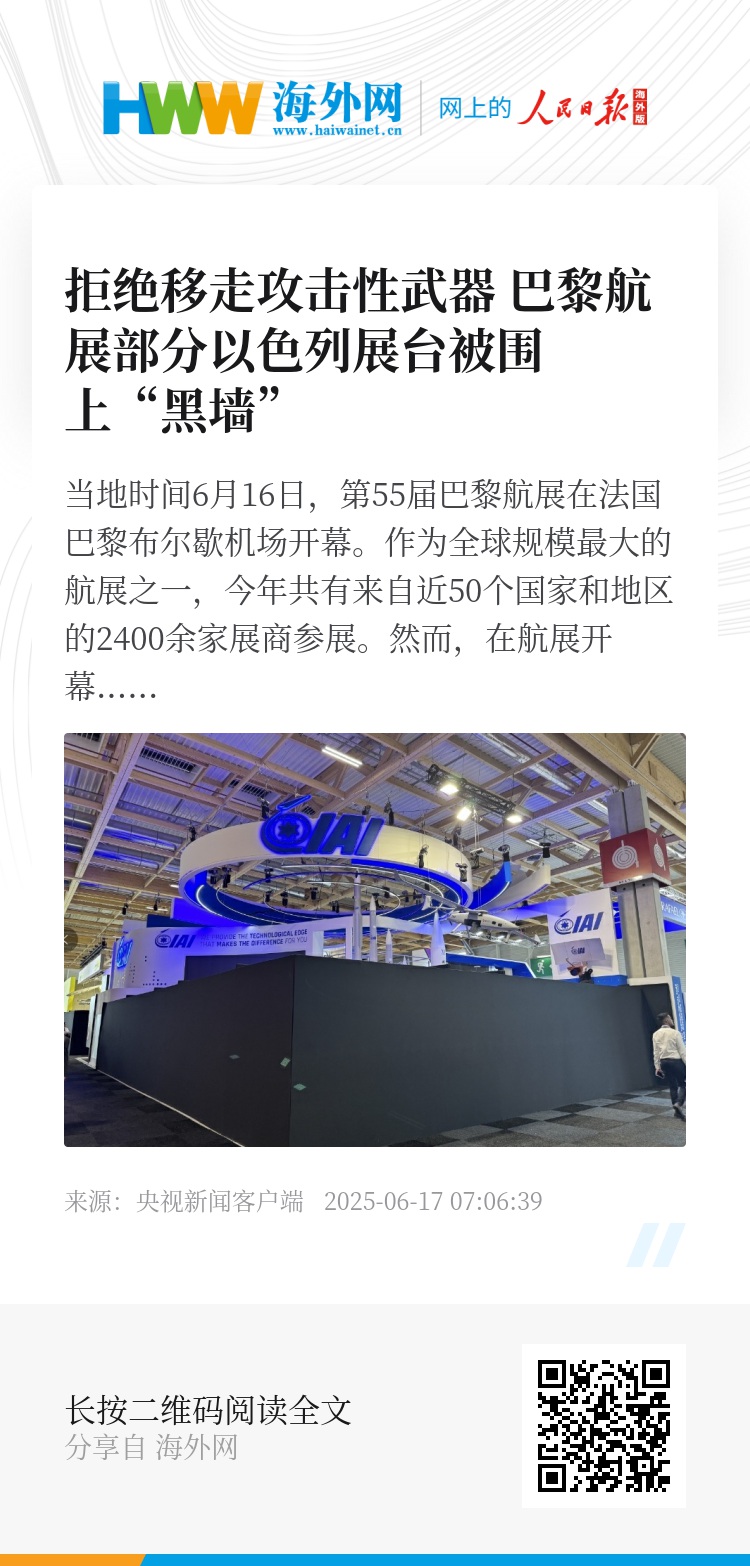 同日,以色列国防部谴责巴黎航展主办方的举动“令人愤怒、史无前例”,要求法方立即撤下黑墙。(总台记者 朱雪松)