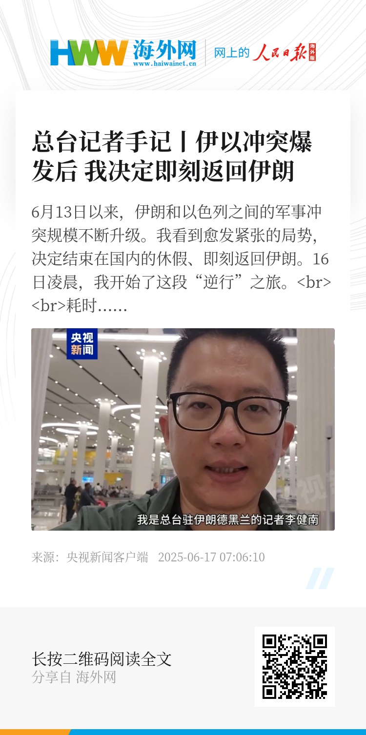 6月13日以来,伊朗和以色列之间的军事冲突规模不断升级。我看到愈发紧张的局势,决定结束在国内的休假、即刻返回伊朗。16日凌晨,我开始了这段“逆行”之旅。