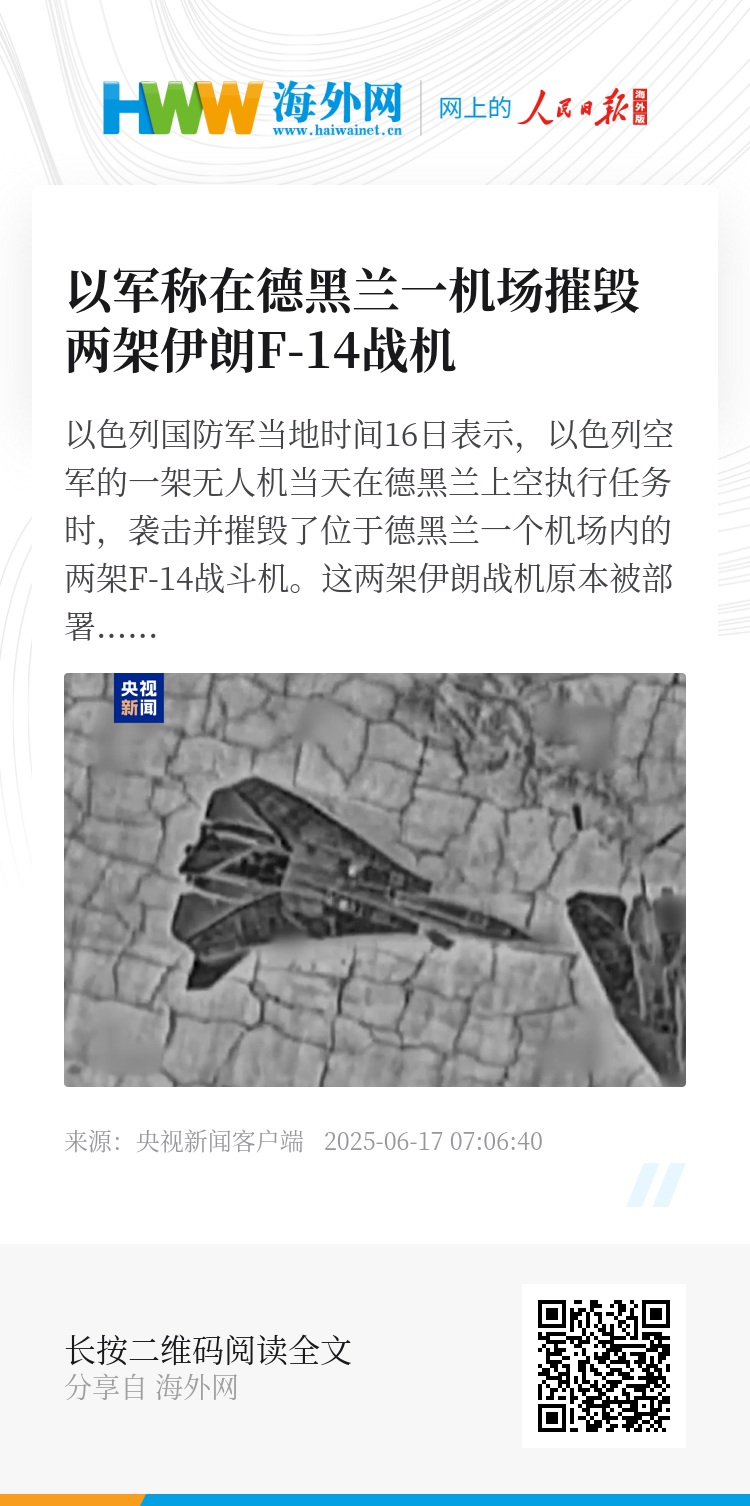 以色列国防军当地时间16日表示,以色列空军的一架无人机当天在德黑兰上空执行任务时,袭击并摧毁了位于德黑兰一个机场内的两架F-14战斗机。这两架伊朗战机原本被部署用于拦截以军行动。以空军还摧毁了一个试图攻击以色列领土的伊朗无人机小组。