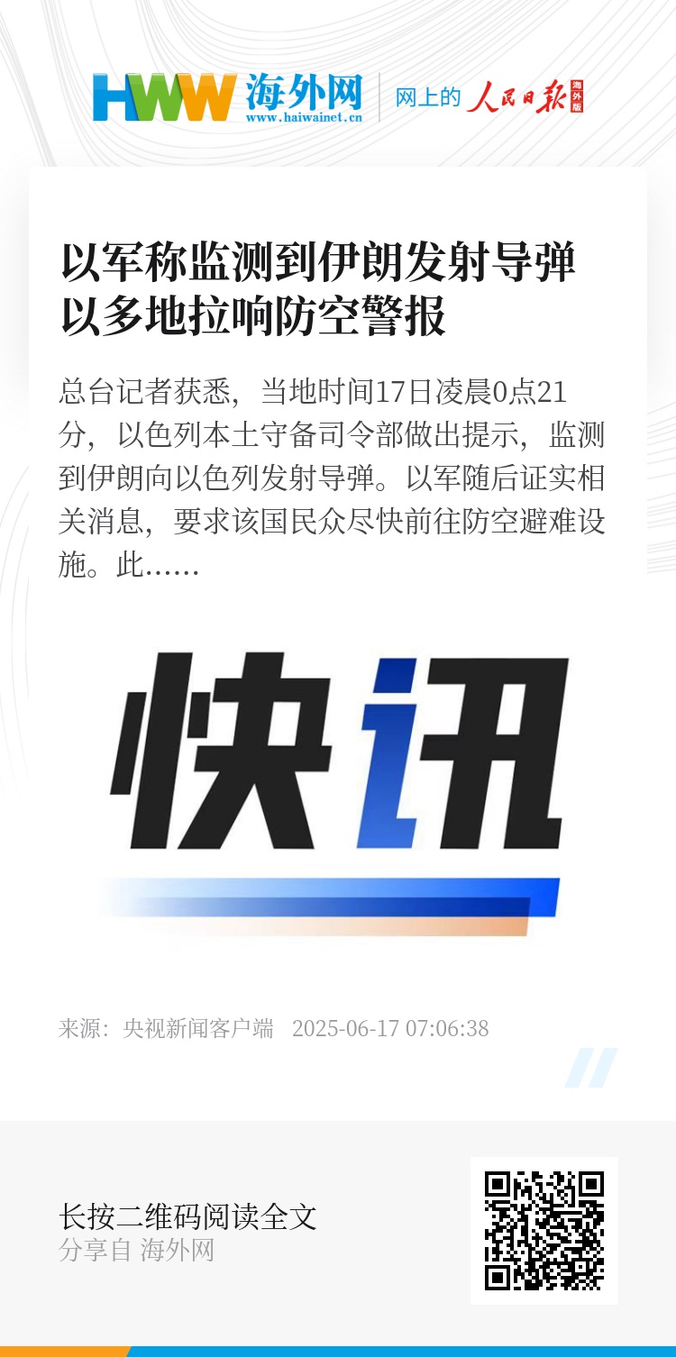 当天稍早前,伊朗伊斯兰革命卫队发言人称,伊朗当地时间6月16日晚开始对以色列发动的新一轮导弹和无人机袭击将持续至天明。(总台记者 赵兵 魏然)