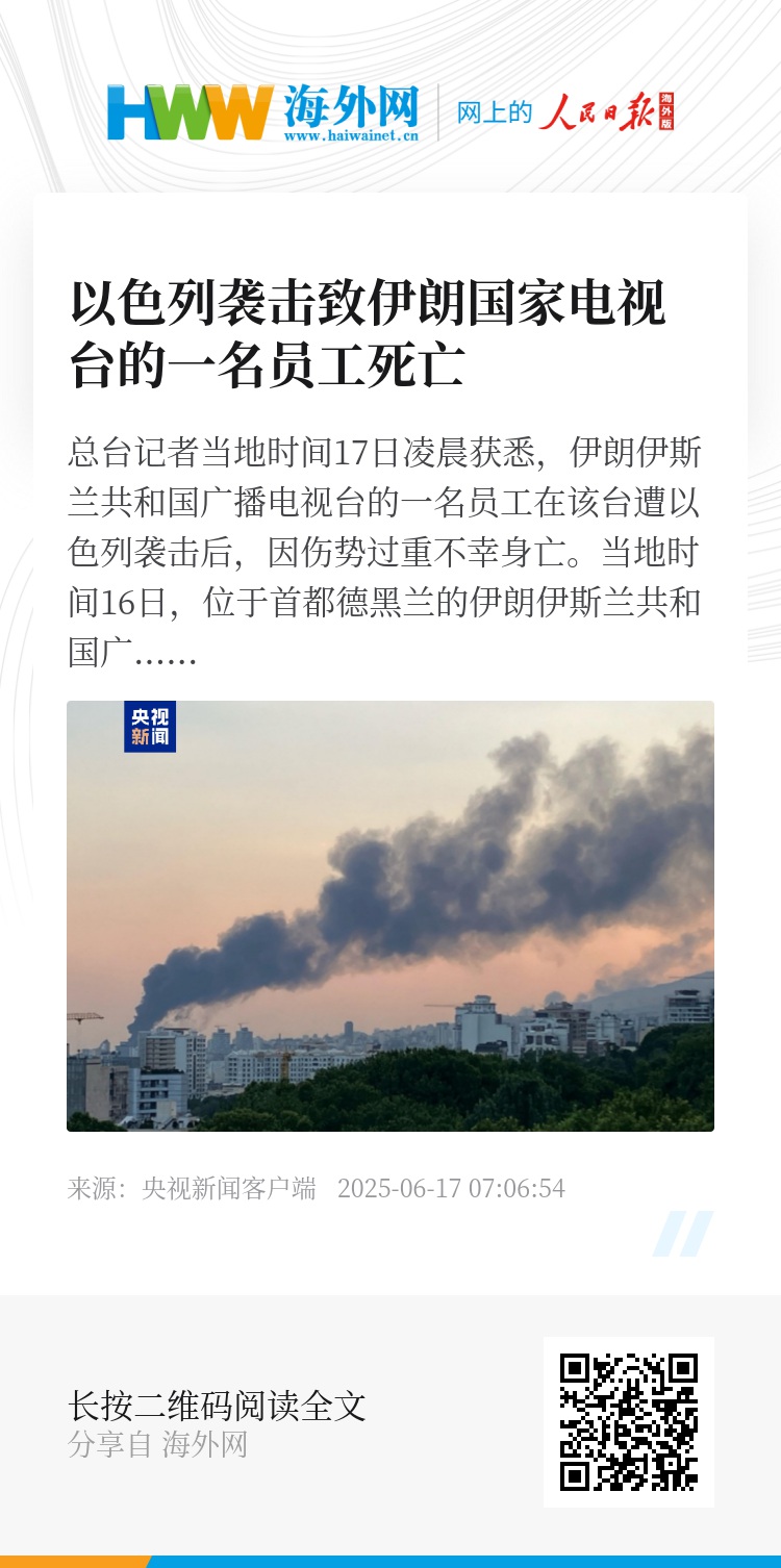 总台记者当地时间17日凌晨获悉,伊朗伊斯兰共和国广播电视台的一名员工在该台遭以色列袭击后,因伤势过重不幸身亡。
