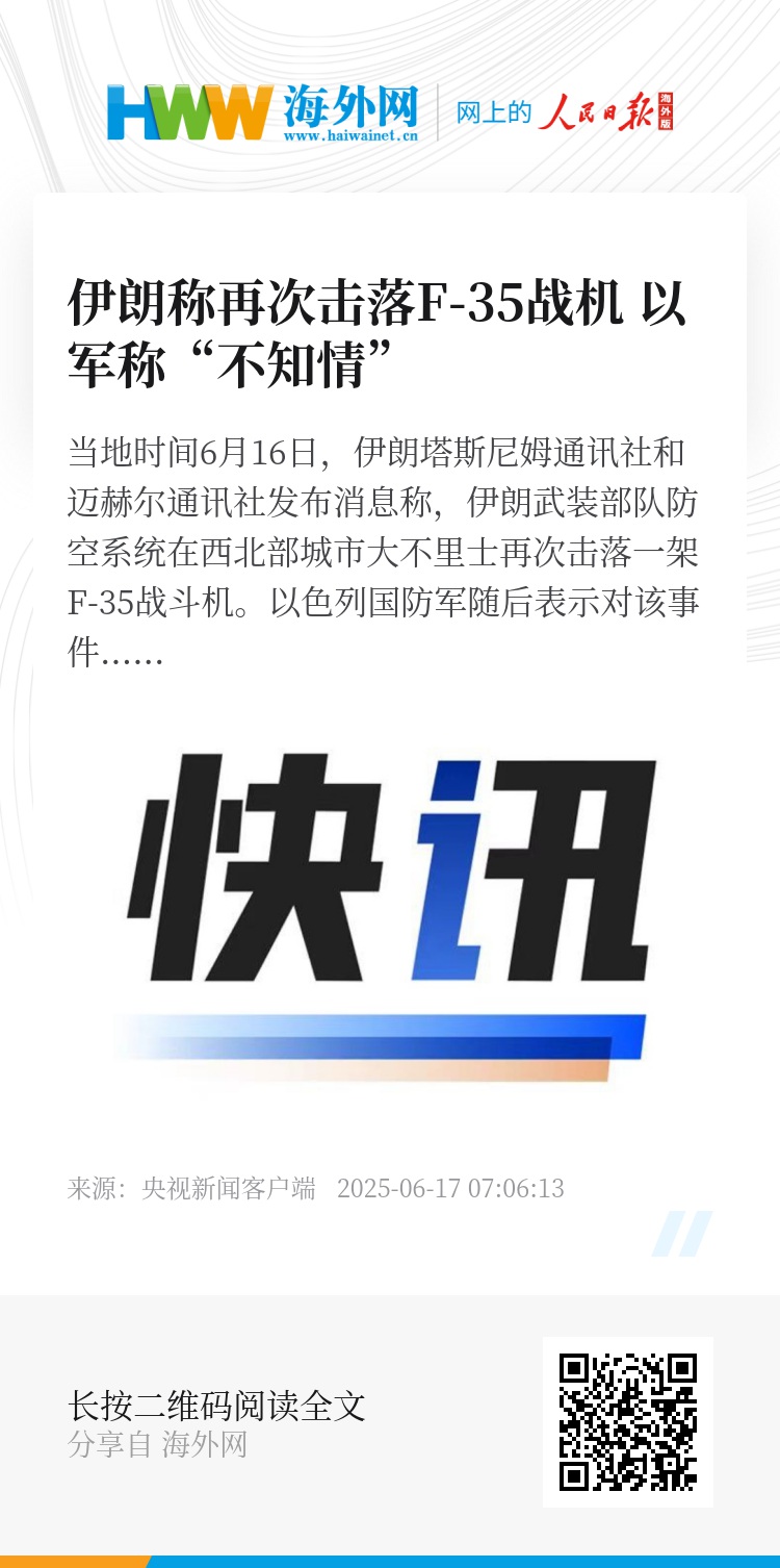 此前,伊朗多次宣称击落以色列的F-35战机。伊朗陆军地面部队6月14日称,击落一架以色列F-35战机并逮捕飞行员。以色列方面曾驳斥战机被伊朗击落的说法,并称其为“假新闻”。
