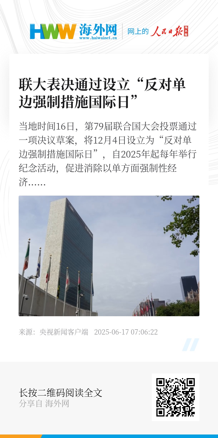 当地时间16日,第79届联合国大会投票通过一项决议草案,将12月4日设立为“反对单边强制措施国际日”,自2025年起每年举行纪念活动,促进消除以单方面强制性经济措施作为政治和经济胁迫的手段。