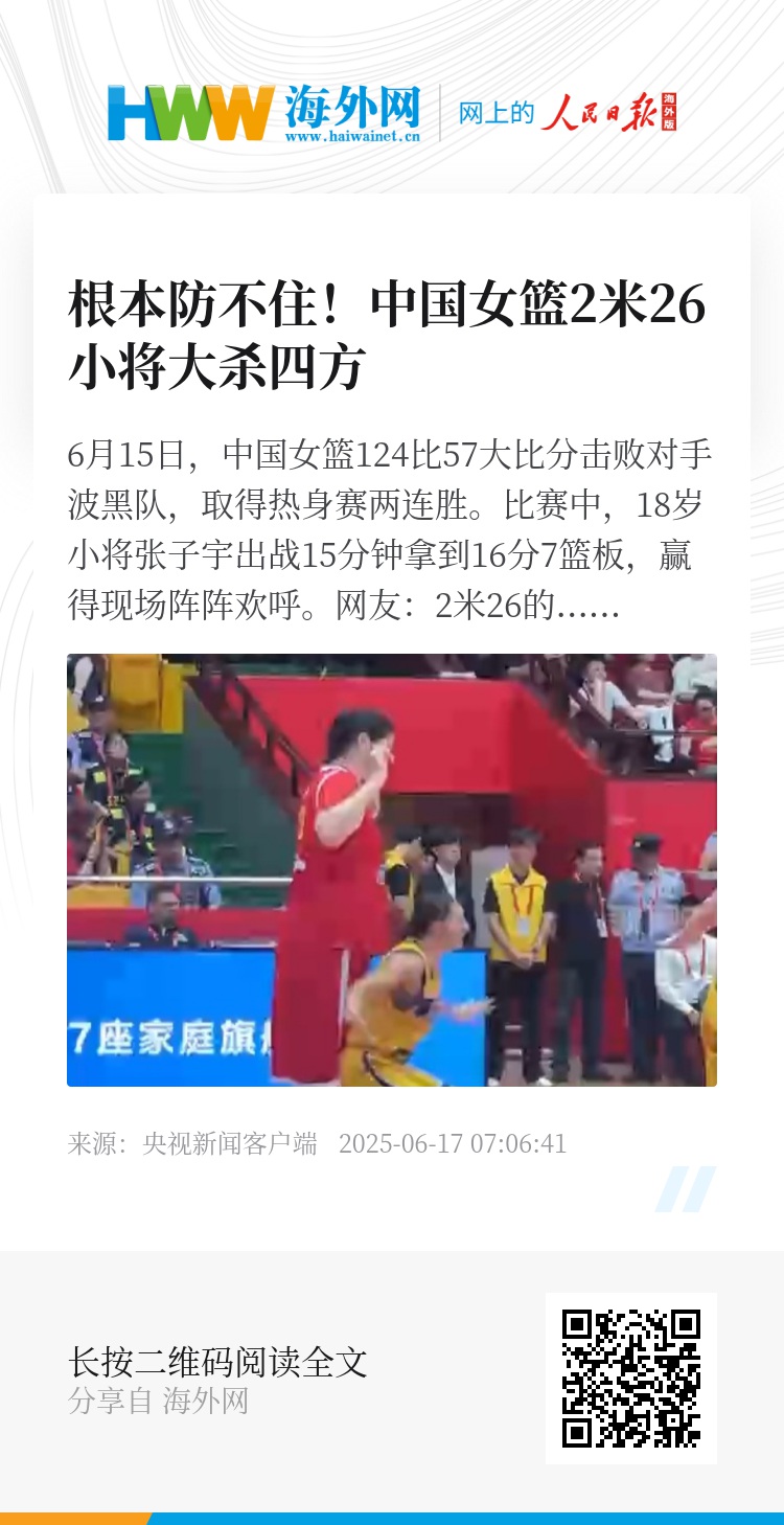 6月15日,中国女篮124比57大比分击败对手波黑队,取得热身赛两连胜。比赛中,18岁小将张子宇出战15分钟拿到16分7篮板,赢得现场阵阵欢呼。网友:2米26的身高怎么防?防不住,根本防不住……戳视频,看中国小将精彩表现!