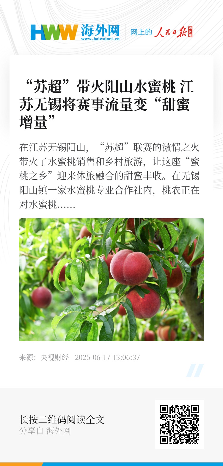 在江苏无锡阳山,“苏超”联赛的激情之火带火了水蜜桃销售和乡村旅游,让这座“蜜桃之乡”迎来体旅融合的甜蜜丰收。