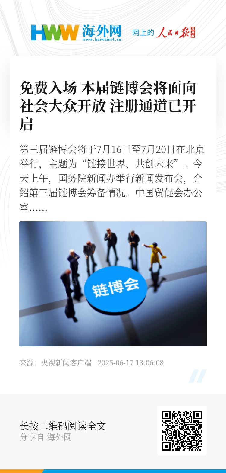 中国贸促会办公室主任杨宓介绍,本届链博会展期为7月16日至20日,其中7月16日至18日主要向专业观众开放,19至20日面向社会大众开放。目前专业观众、采购商、媒体记者和公众注册通道均已开启,所有观众都可以免费入场。欢迎大家通过中国贸促会微信公众号以及链博会官网、公众号等渠道提前进行注册。