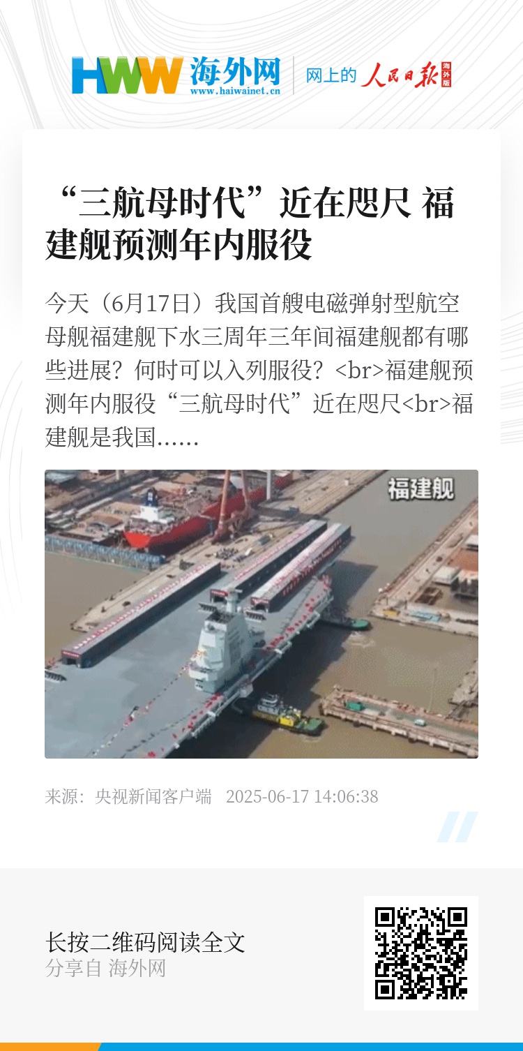本台评论员 魏东旭:航母福建舰捷报频传,海上测试工作进展得非常顺利,预测在今年可以服役。