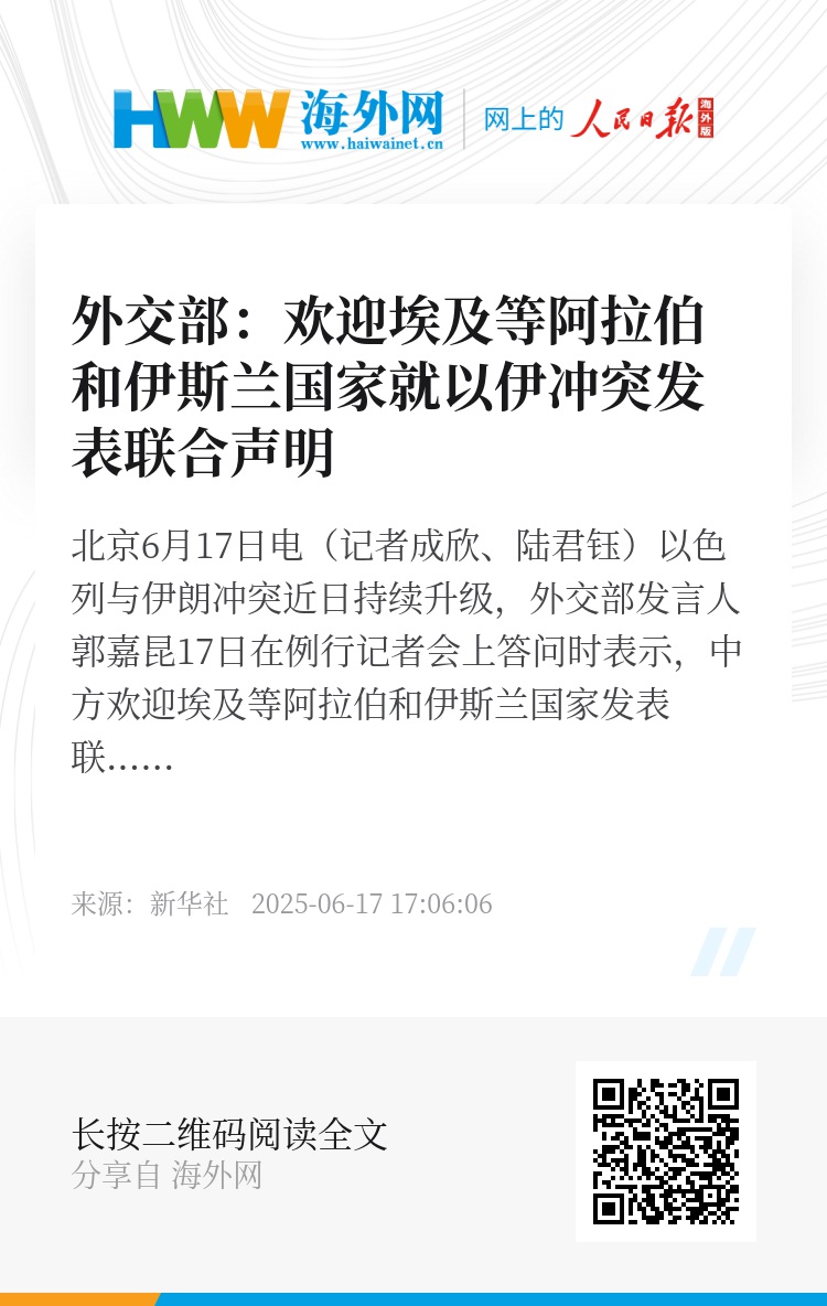 新华社北京6月17日电(记者成欣、陆君钰)以色列与伊朗冲突近日持续升级,外交部发言人郭嘉昆17日在例行记者会上答问时表示,中方欢迎埃及等阿拉伯和伊斯兰国家发表联合声明,赞赏有关国家为推动局势降温付出的努力。