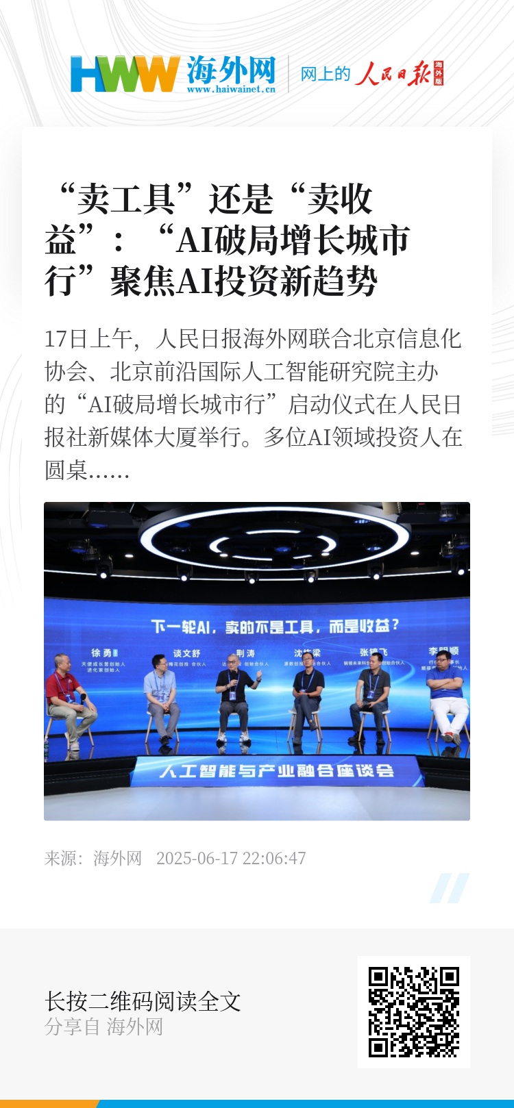 海外网6月17日电 17日上午,人民日报海外网联合北京信息化协会、北京前沿国际人工智能研究院主办的“AI破局增长城市行”启动仪式在人民日报社新媒体大厦举行。多位AI领域投资人在圆桌论坛环节以“下一轮AI,卖的不是工具,而是收益?”为主题展开深入探讨。