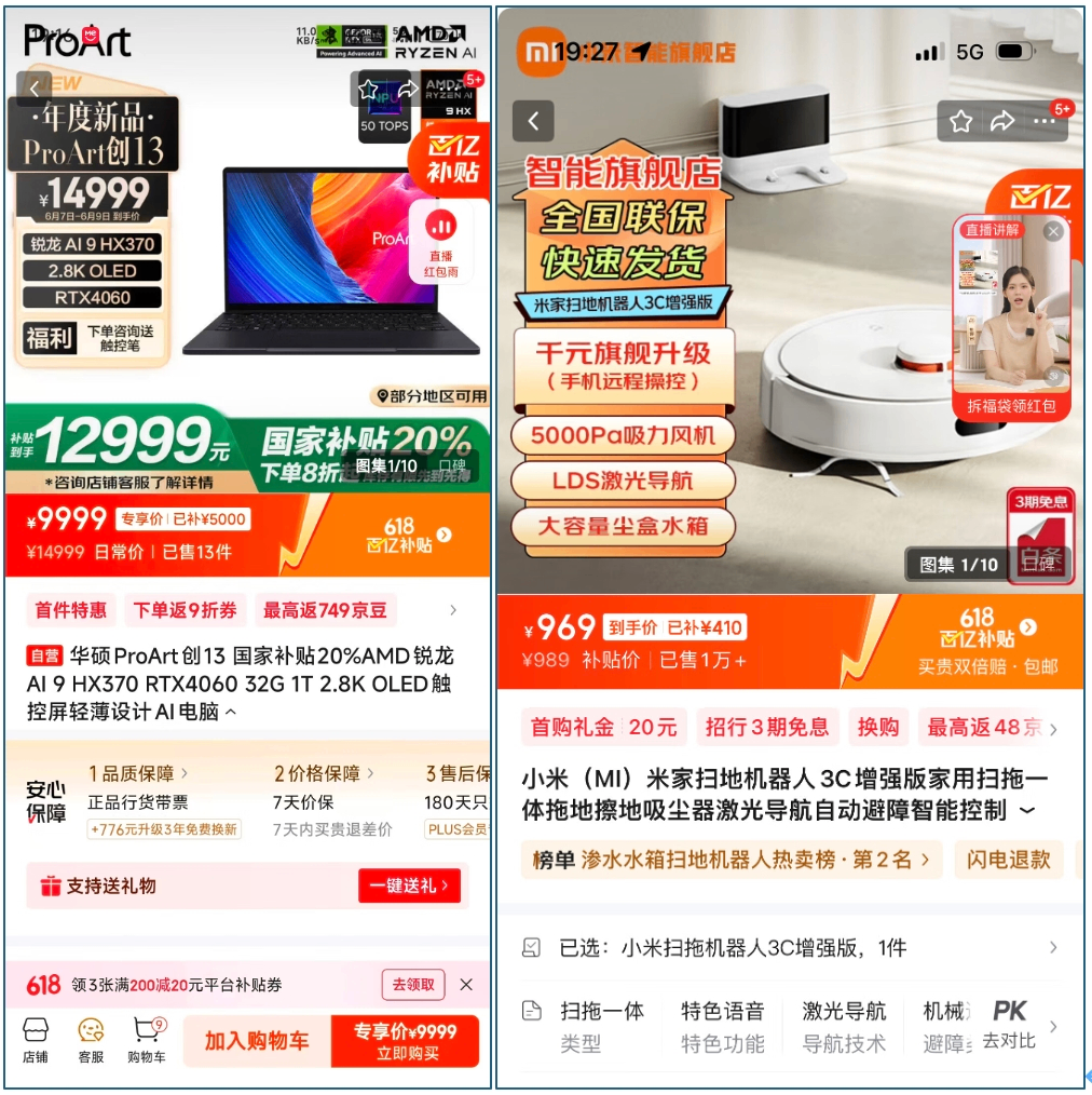 京东百亿补贴火力全开。以华硕ProArt创13笔记本为例,原价14999元,百亿补贴直降5000元,到手只要9999元。小米扫拖机器人3c增强版,京东百亿补贴也直降410元,到手价仅需969元。特别是在京东618期间,部分爆品百亿补贴低至2折。
