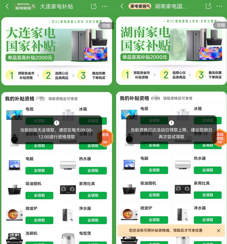 如果页面提示“国补资格暂无法领取”等信息,则可判定该区域国补活动已暂时下线;如果领取时提示“当前时段无法领取”等信息,则表示该地区国补资格每日限量,需要在指定时间来抢。尤其在近期国补资源紧张、数量有限,且很多地区有时间限制的情况下,不妨尽快来京东抢国补、用国补。