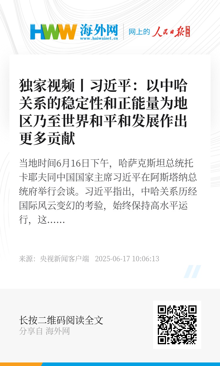 习近平指出,中哈关系历经国际风云变幻的考验,始终保持高水平运行,这得益于山水相连的地缘优势和世代友好的历史传承,也是两国共谋发展的必然选择。中方始终从战略高度和长远角度看待和发展中哈关系,愿同哈方一道,坚定不移巩固中哈友好,以中哈关系的稳定性和正能量为地区乃至世界和平和发展作出更多贡献。