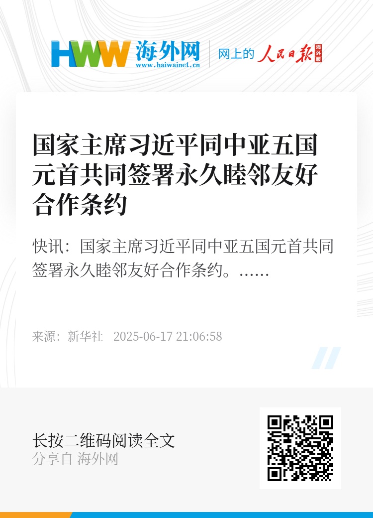 新华社快讯:国家主席习近平同中亚五国元首共同签署永久睦邻友好合作条约。