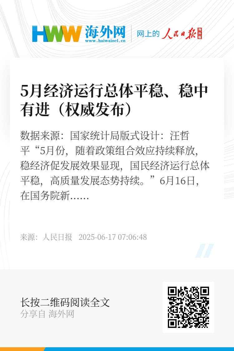 1至5月份,工业高端化、智能化、绿色化发展稳步推进,服务消费潜力释放,规模以上工业增加值、服务业生产指数同比分别增长6.3%和5.9%,与一季度相比保持总体平稳;社会消费品零售总额同比增长5%,比一季度有所加快;固定资产投资增长3.7%,保持基本稳定……一系列指标,表明中国经济稳定增长势头没有改变,高质量发展态势没有改变,向新向好发展趋势没有改变。
