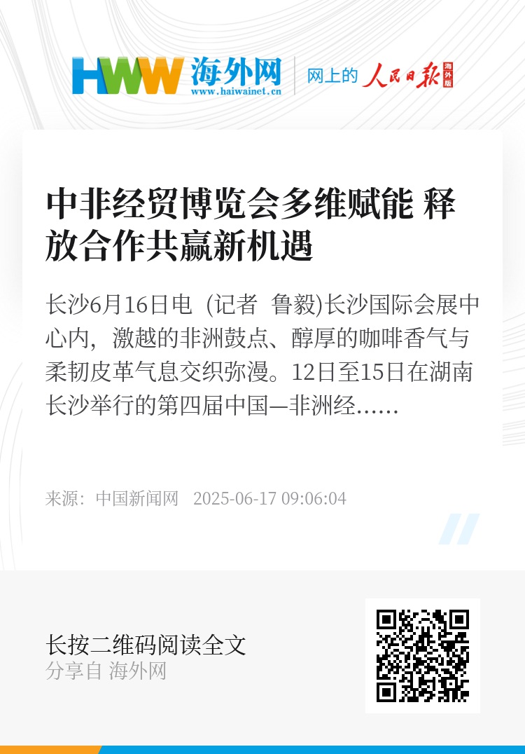中新网长沙6月16日电 (记者 鲁毅)长沙国际会展中心内,激越的非洲鼓点、醇厚的咖啡香气与柔韧皮革气息交织弥漫。12日至15日在湖南长沙举行的第四届中国—非洲经贸博览会,将中非合作的纽带向纵深延展,正悄然成为撬动更深更广合作机遇的支点。