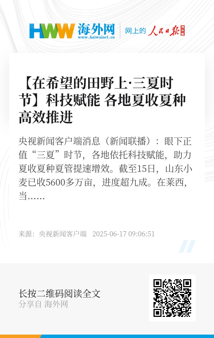 央视新闻客户端消息(新闻联播):眼下正值“三夏”时节,各地依托科技赋能,助力夏收夏种夏管提速增效。