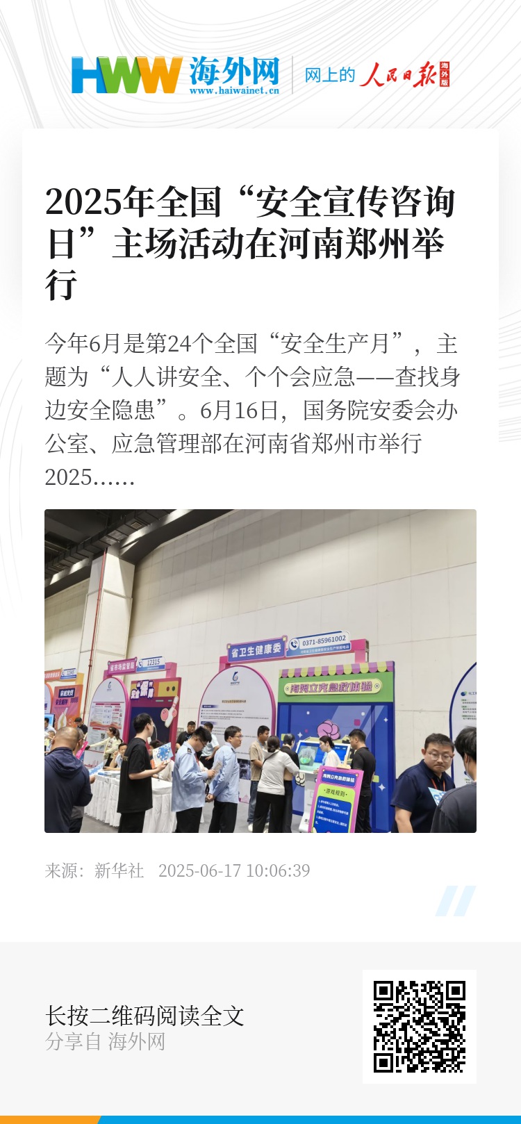 今年6月是第24个全国“安全生产月”,主题为“人人讲安全、个个会应急——查找身边安全隐患”。6月16日,国务院安委会办公室、应急管理部在河南省郑州市举行2025年全国“安全宣传咨询日”主场活动。