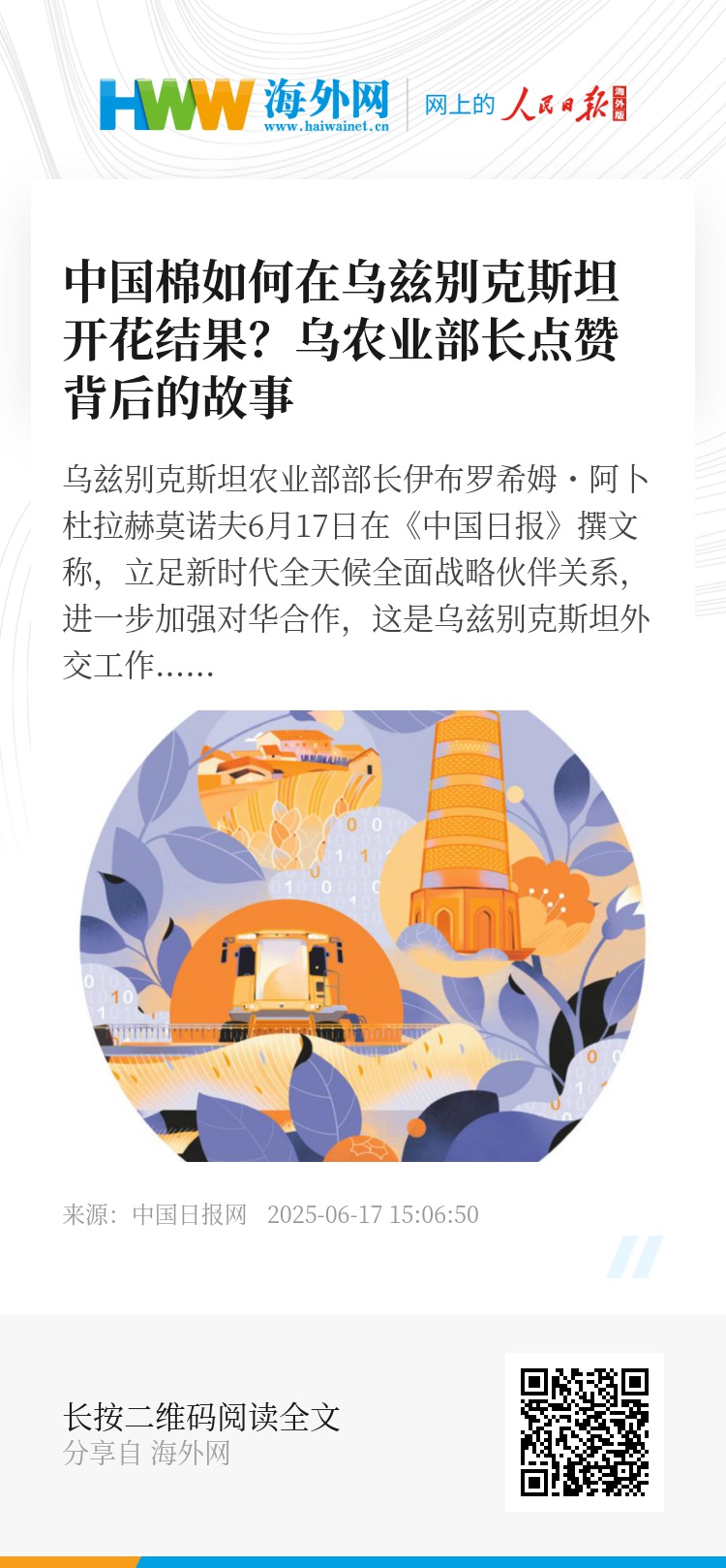 乌兹别克斯坦农业部部长伊布罗希姆・阿卜杜拉赫莫诺夫6月17日在《中国日报》撰文称,立足新时代全天候全面战略伙伴关系,进一步加强对华合作,这是乌兹别克斯坦外交工作的重点方向之一。尤其值得一提的是,中乌农业合作已经结出累累硕果。