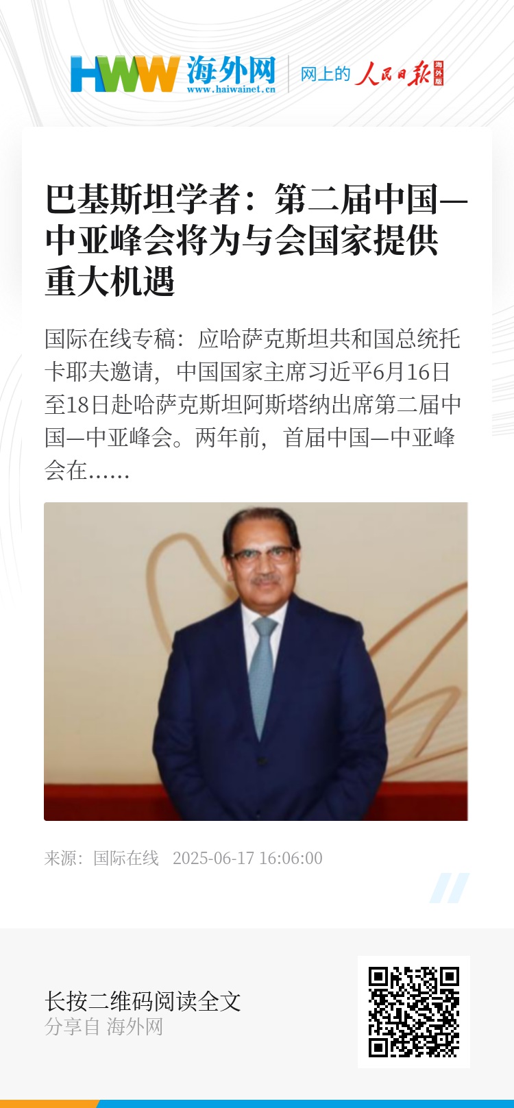 国际在线专稿:应哈萨克斯坦共和国总统托卡耶夫邀请,中国国家主席习近平6月16日至18日赴哈萨克斯坦阿斯塔纳出席第二届中国—中亚峰会。两年前,首届中国—中亚峰会在西安举行,中国与中亚五国宣布构建更加紧密的中国—中亚命运共同体。如今,中国—中亚命运共同体建设将踏上新征程。巴基斯坦“读懂中国”论坛理事长扎法尔在接受国际在线记者专访时指出,此次峰会将深化中国—中亚区域合作与互信,为共同发展与区域和平稳定注入新动力。