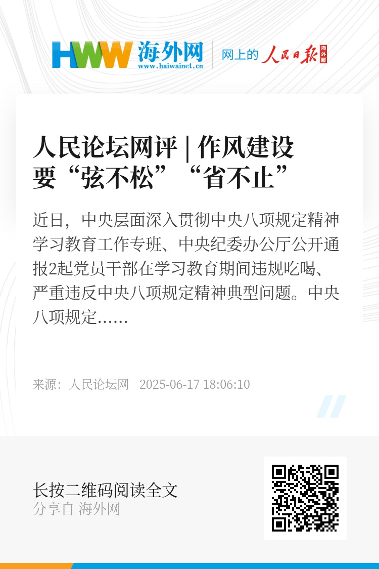 近日,中央层面深入贯彻中央八项规定精神学习教育工作专班、中央纪委办公厅公开通报2起党员干部在学习教育期间违规吃喝、严重违反中央八项规定精神典型问题。中央八项规定作为全面从严治党的“金色名片”,其精神内核已成为新时代作风建设的根本遵循。广大党员干部要持之以恒、常抓不懈,时刻保持清醒,永葆清正廉洁的政治本色。