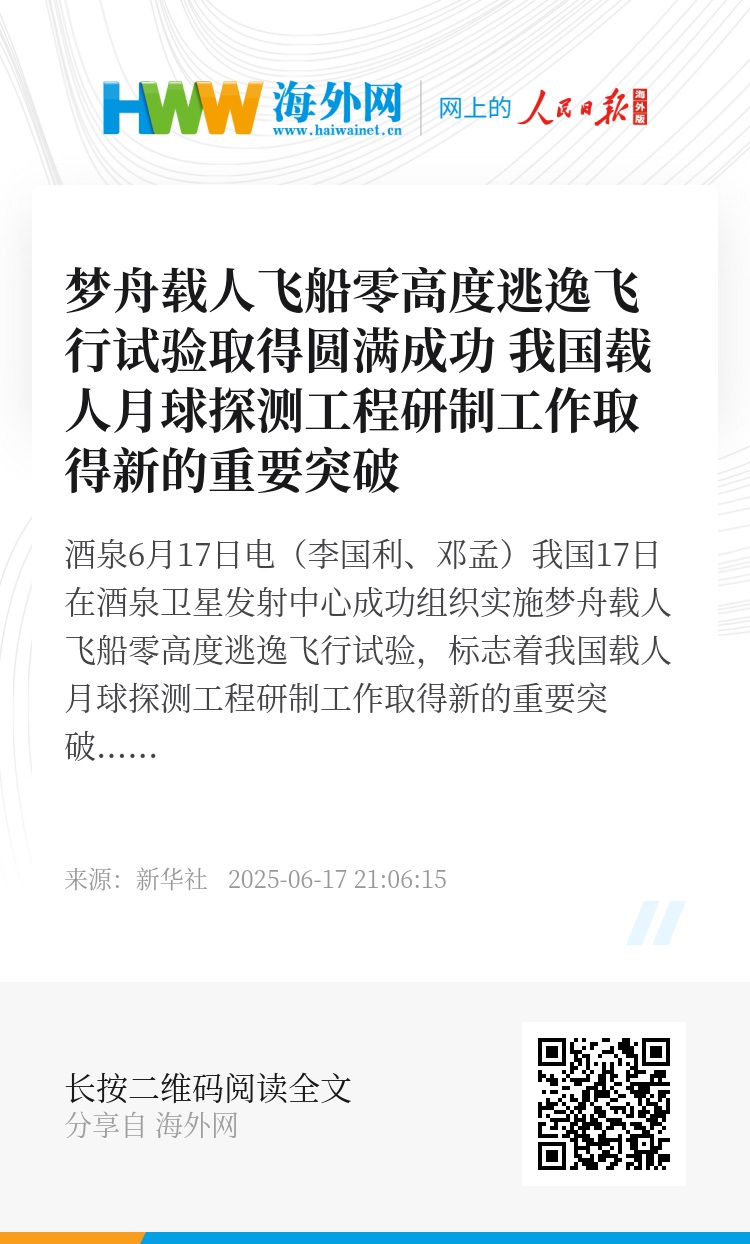 新华社酒泉6月17日电(李国利、邓孟)我国17日在酒泉卫星发射中心成功组织实施梦舟载人飞船零高度逃逸飞行试验,标志着我国载人月球探测工程研制工作取得新的重要突破。