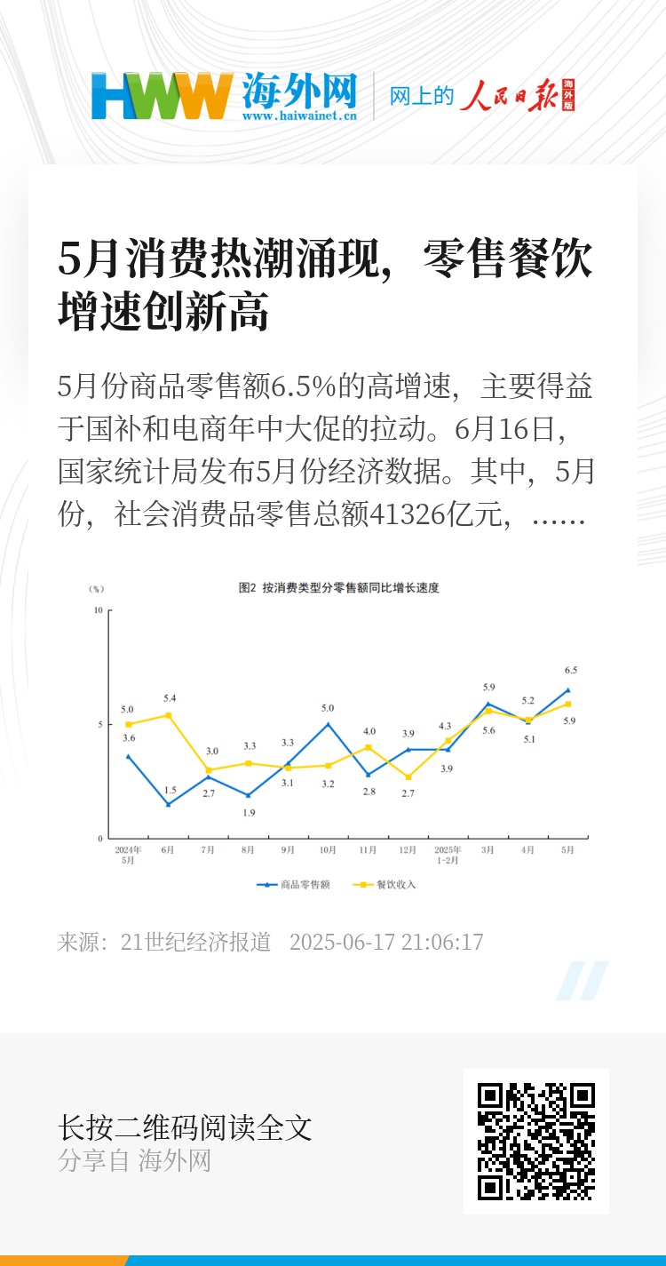 6月16日,国家统计局发布5月份经济数据。其中,5月份,社会消费品零售总额41326亿元,同比增长6.4%,达到2024年以来的最高增速。按消费类型分,5月份,商品零售额36748亿元,同比增长6.5%,是2024年以来的最高增速;餐饮收入4578亿元,增长5.9%,是2024年4月以来的最高增速。