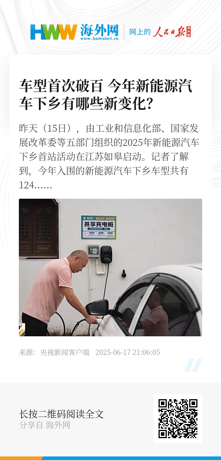 这家车企的相关负责人告诉记者,今年他们共有9款新能源车型入围新一轮下乡目录,不仅包括经济实惠的代步车,还有像SUV和MPV等满足多功能需求的车型。