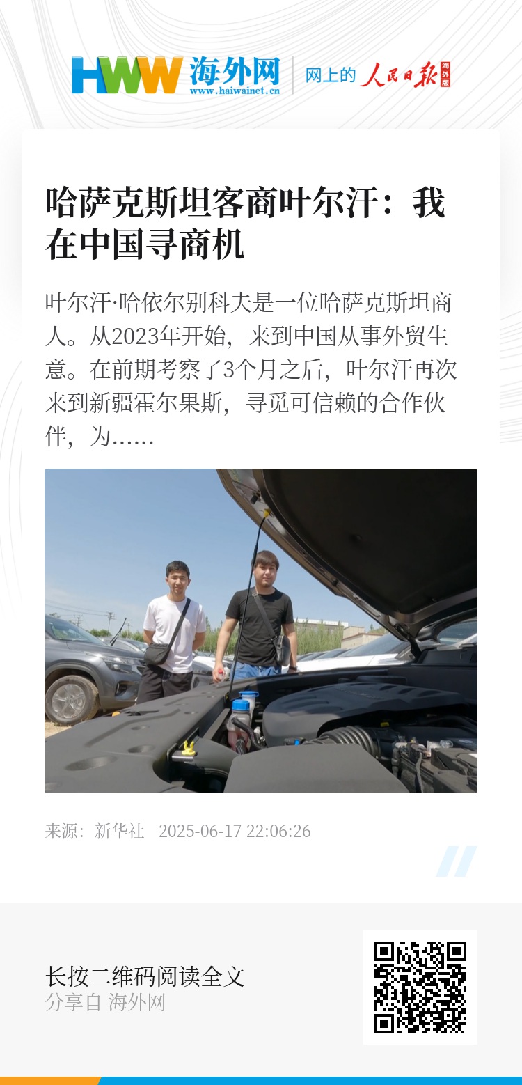 叶尔汗·哈依尔别科夫是一位哈萨克斯坦商人。从2023年开始,来到中国从事外贸生意。在前期考察了3个月之后,叶尔汗再次来到新疆霍尔果斯,寻觅可信赖的合作伙伴,为哈萨克斯坦引进优质商用车。