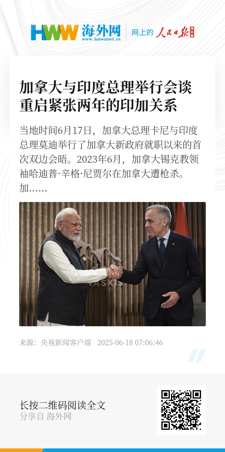 当地时间6月17日,加拿大总理卡尼与印度总理莫迪举行了加拿大新政府就职以来的首次双边会晤。