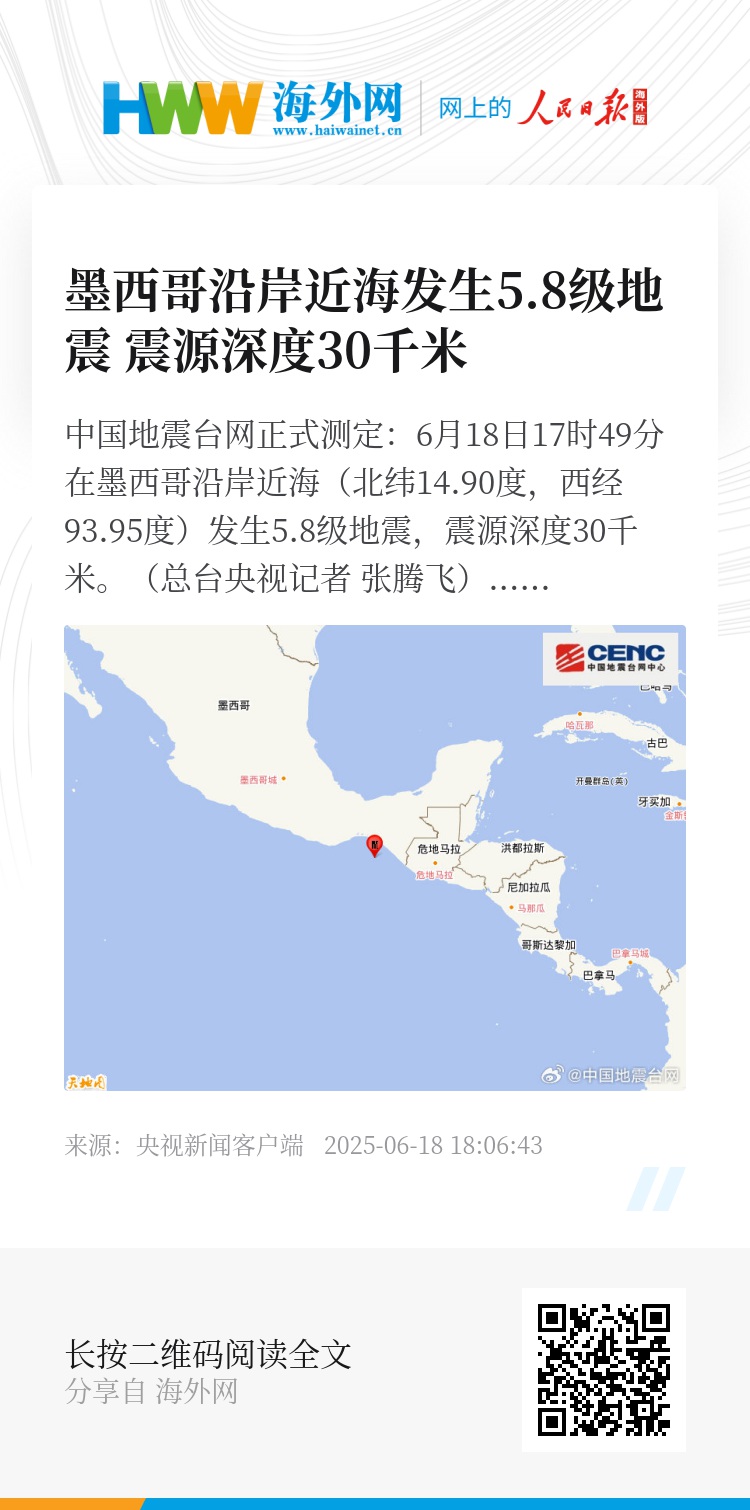 中国地震台网正式测定:6月18日17时49分在墨西哥沿岸近海(北纬14.90度,西经93.95度)发生5.8级地震,震源深度30千米。