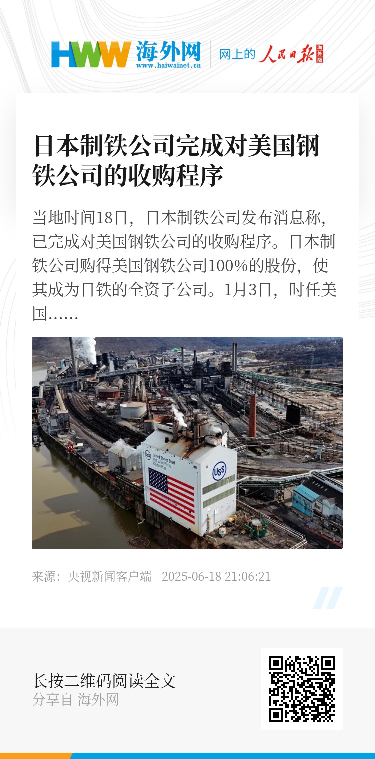 当地时间18日,日本制铁公司发布消息称,已完成对美国钢铁公司的收购程序。日本制铁公司购得美国钢铁公司100%的股份,使其成为日铁的全资子公司。