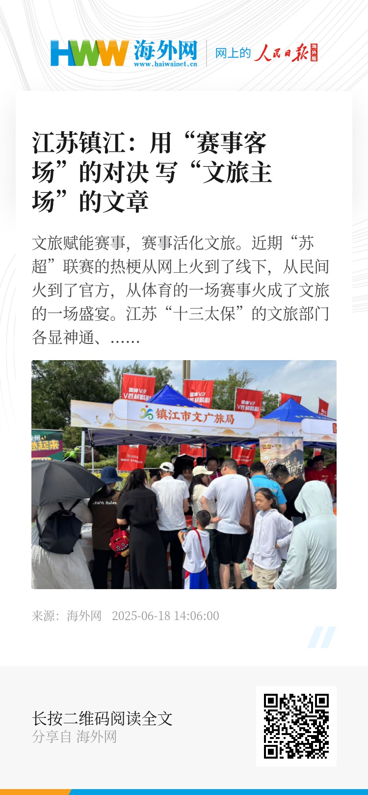 看似是足球比赛的客场,实则是文旅推介的主场。借助球赛所聚拢的天量人气,镇江文旅将独特的历史文化底蕴和旅游休闲体验带到主场城市,为绿茵场内的激烈对决平添了几分场外的松弛趣味。