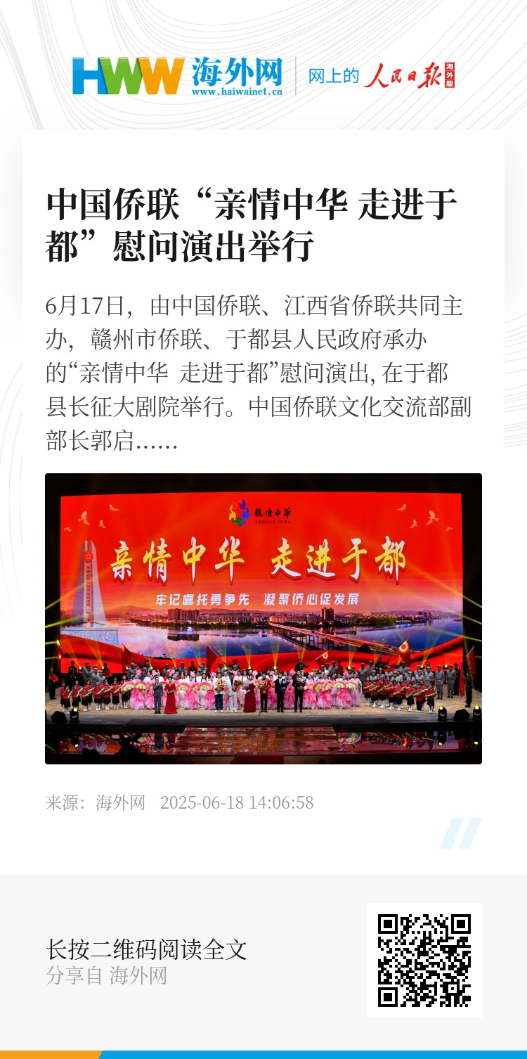 6月17日,由中国侨联、江西省侨联共同主办,赣州市侨联、于都县人民政府承办的“亲情中华 走进于都”慰问演出,在于都县长征大剧院举行。中国侨联文化交流部副部长郭启华,江西省侨联党组成员、副主席郭子新,市领导黄蓬勃等出席。