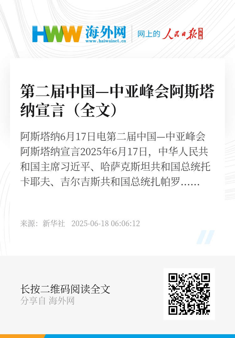 2025年6月17日,中华人民共和国主席习近平、哈萨克斯坦共和国总统托卡耶夫、吉尔吉斯共和国总统扎帕罗夫、塔吉克斯坦共和国总统拉赫蒙、土库曼斯坦总统别尔德穆哈梅多夫、乌兹别克斯坦共和国总统米尔济约耶夫在阿斯塔纳共同举行第二届中国—中亚峰会。