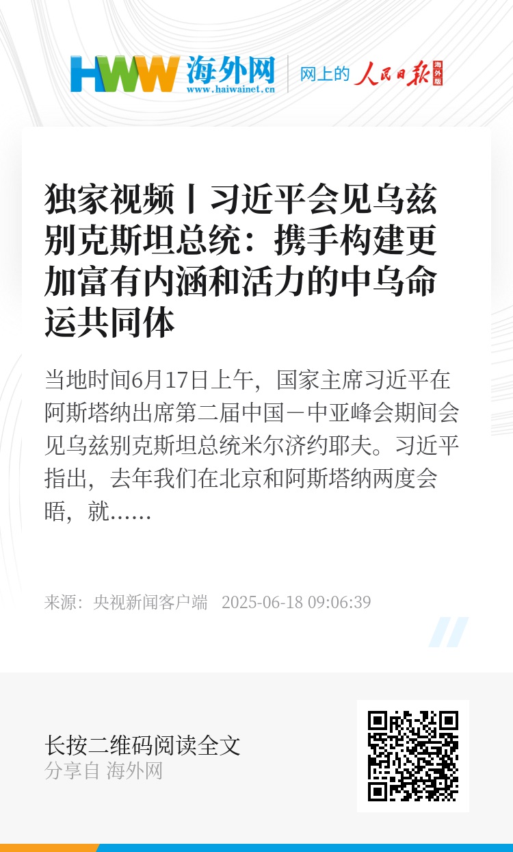 当地时间6月17日上午,国家主席习近平在阿斯塔纳出席第二届中国-中亚峰会期间会见乌兹别克斯坦总统米尔济约耶夫。